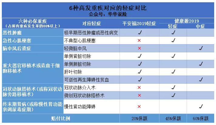 可以看出,覆蓋了與輕症對應的6種高發重疾,可以看出健康源2019的輕症/中症的保障更全麵。