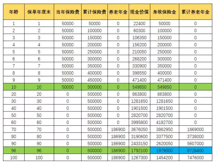 30歲安母親給她的兒子剛剛滿月安 小寶,投保天安生活故事福尊享,選擇10年支付,一年支付5萬元,總付費50萬元,選擇60歲領取養老金年金,基本保險金額18.69萬元,保險期限為終身。然後安 小寶從60歲開始,你可以每年領取186,900元作為家庭養老金補助,直至終身。假設安 小寶 96歲死亡,共收到36個養老金年金,共計678.44萬元,並給家人留下了179萬元。
