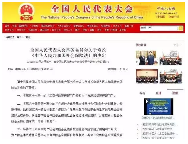 2018年12月29日,第十三屆全國人大常委會第七次會議通過《全國人民代表大會常務委員會關於修改〈中華人民共和國社會保險法〉的決定》