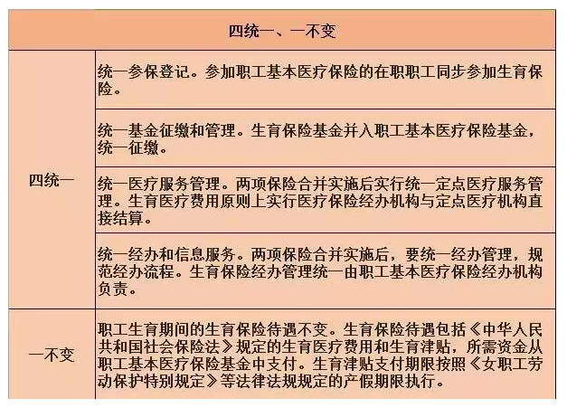 關於上述導頻程序的導頻內容中,其概括為“四個統一的、和一個未改變的”。即統一保險登記、統一資金收集和管理、統一醫療服務管理、統一管理和信息服務,生育期間的生育保險待遇保持不變。具體如下: