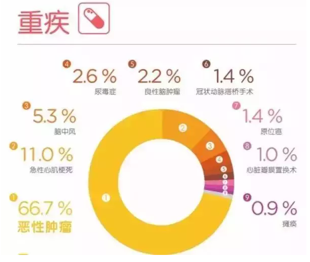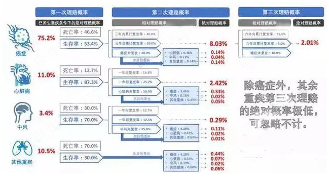2)心髒病後第二次心髒複發的概率為2.42%;所有其他責任,無論是患有癌症和其他嚴重疾病,還是患有其他嚴重疾病和癌症,都不會超過2%。