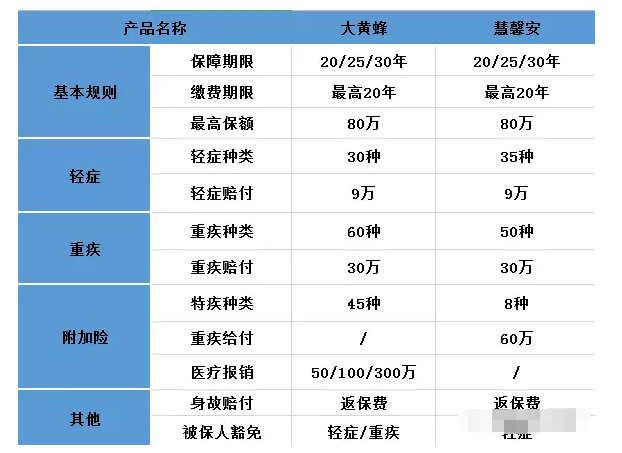 對(dui)於(yu)該(gai)產(chan)品(pin),小(xiao)小(xiao)梅(mei)認(ren)為(wei)大(da)黃(huang)蜂(feng)兒(er)童(tong)的(de)重(zhong)大(da)疾(ji)病(bing)保(bao)險(xian)或(huo)慧(hui)馨(xin)安(an)兒(er)童(tong)的(de)常(chang)規(gui)重(zhong)病(bing)保(bao)險(xian)相(xiang)當(dang)不(bu)錯(cuo)。這(zhe)兩(liang)種(zhong)產(chan)品(pin)相(xiang)似(si)並(bing)含(han)有(you)兒(er)童(tong)的(de)特(te)定(ding)疾(ji)病(bing),有(you)8種慧馨安和45種大黃蜂。如果您不幸患有特定的嚴重疾病,慧馨安賠付會使保額增加一倍,而大黃蜂則會獲得保額,並且可以享受高達300萬的醫療報銷保額。具體分析具體情況,哪個產品更好還是要看自己的情況,按需購買。