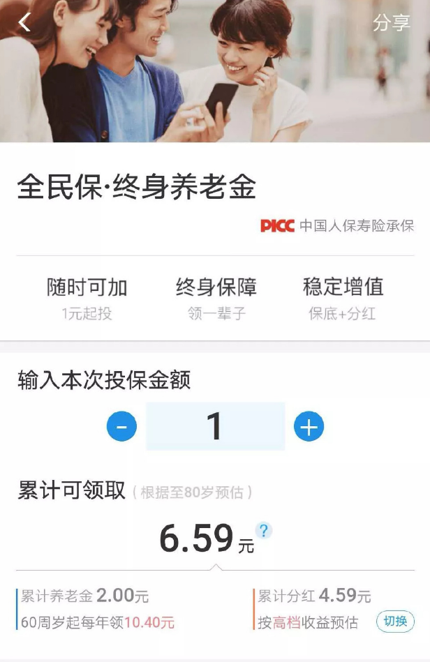 支付寶全民保·終身養老金,條款名叫:人保壽險聚財保養老年金險(分紅型)。背後的承保公司是中國人保集團的“人民人壽保險公司”,支付寶和他結合,可以被視為一個強大的聯盟。
