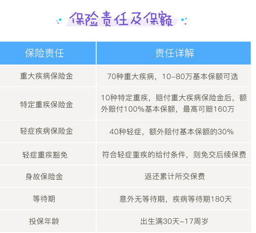 其中70種重大疾病賠付100%的保險金額,合同在支付後終止,還有另外10種其他特定疾病是賠付保險金額的兩倍,類似於慧馨安產品責任,但慧馨安是8種特點疾病,如圖所示: