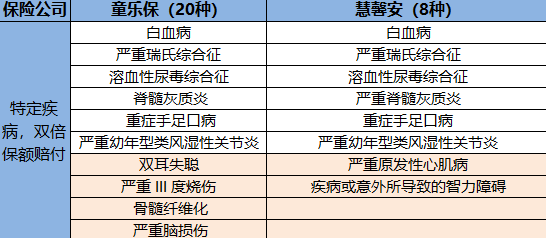 其中童樂保含有高危疾病,白血病,嚴重的手足口病,燒傷,腦損傷,而慧馨安8種,但基本上重病是重合的,整體差異並不大。