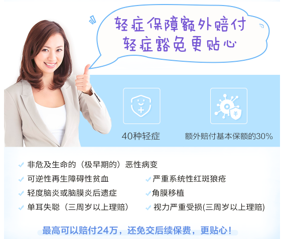 中荷生命童樂保兒童的重大疾病,其中輕疾額外30%的保險金額,輕度疾病後保險費用豁免,剩餘重病保障責任繼續有效,輕症疾病類型40種,也非常完整,比慧馨安的35輕疾多一點,但基本的輕疾是完整的,這種差異