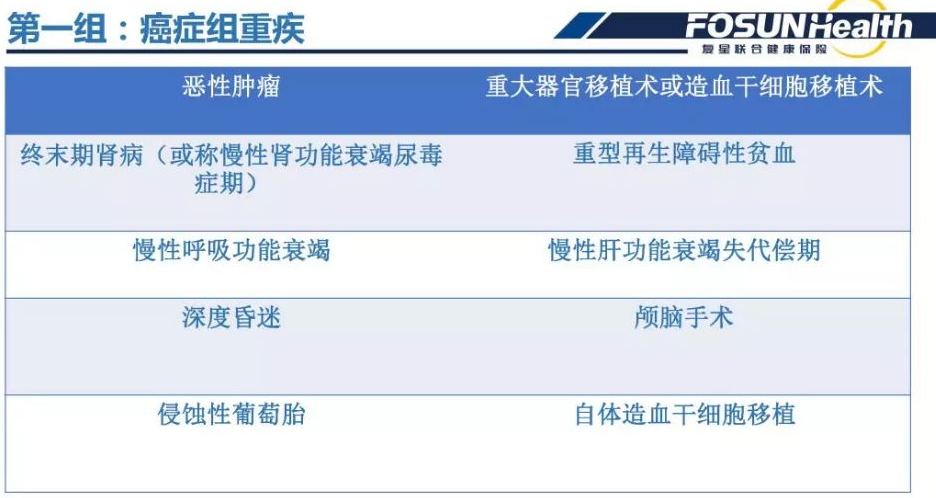 80種疾病分為2組。第一組10種疾病,包括惡性腫瘤、主要器官移植或造血幹細胞移植、終末期腎病三大高危重大疾病;第二組70種疾病包括急性心肌梗死、腦中風後遺症、冠狀動脈搭橋術3種高發疾病。