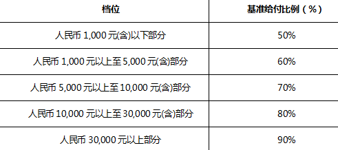 3、住院治療:每次事故100元,基準支付比例如下:(如果住院費通過社會保障或其他商業醫療報銷已達到70%以上,其餘部分可能無法按照分級累進階梯給付,扣除免賠額後支付100%比例。)