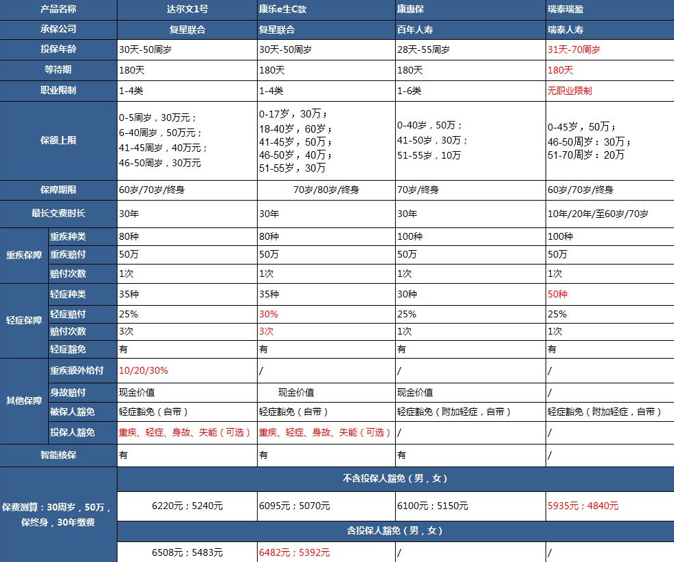 為了便於比較,多保魚把達爾文1號、百年康惠保、 瑞泰瑞盈和複星聯合康樂e生中進行了比較:
