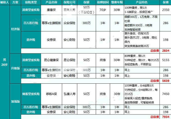 至於增強版,重大疾病保險已經升級為多次賠付的哆啦A保,主要是考慮到重病後,很難買到重大疾病保險。哆啦A保可以支付3次,但也能保障身故,價格中等,非常適合年輕人。