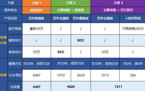 方案2:隻要它是重疾,它一次可以賠付50 萬,身故可再賠 50 萬。相比之下,方案2的保障更全麵,但保費會更貴一些。
