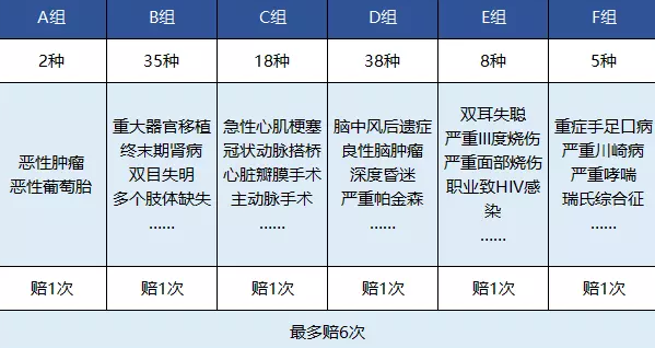 該產品將106種危重疾病分為6組,每組包含數種至數十種疾病。隻要賠付在某一組中的某種疾病,整個組中的其他疾病也會丟失保障。
