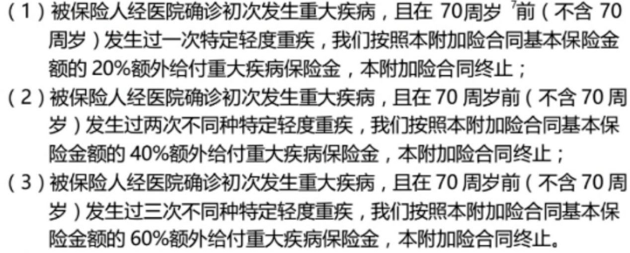 平安福的特點是,如果您在輕症之後患有嚴重疾病,每種嚴重疾病的保額將增加20%: