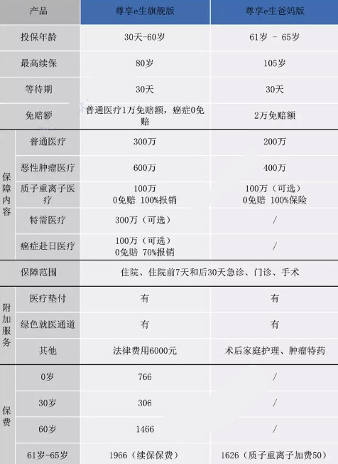 尊享e生爸媽版的保障內容類似於尊享e生旗艦版e,並且由重大事故或疾病引起的住院費用的報銷不限製醫療保險的內外。