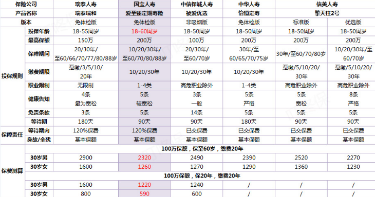 下麵,多保魚選擇市場上幾種流行的定期壽險和[愛至臻定期壽險]進行比較評估。