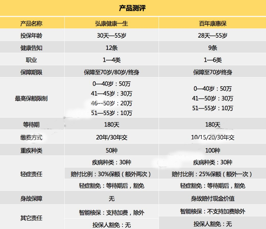 很hen多duo有you挑tiao選xuan重zhong疾ji險xian經jing驗yan的de客ke戶hu可ke能neng都dou會hui在zai一yi些xie產chan品pin之zhi間jian糾jiu結jie,今jin天tian我wo們men要yao討tao論lun的de百bai年nian康kang惠hui保bao和he弘hong康kang健jian康kang一yi生sheng都dou是shi非fei常chang優you秀xiu的de重zhong大da疾ji病bing保bao險xian,保bao障zhang都dou非fei常chang全quan麵mian,而er且qie都dou涵han蓋gai輕qing症zheng責ze任ren,也ye都dou支zhi持chi隻zhi能neng核he保bao。但dan是shi實shi際ji上shang這zhe兩liang款kuan產chan品pin還是有一些區別的,今天我們就來分析一下這兩款重疾險產品哪個更值得購買