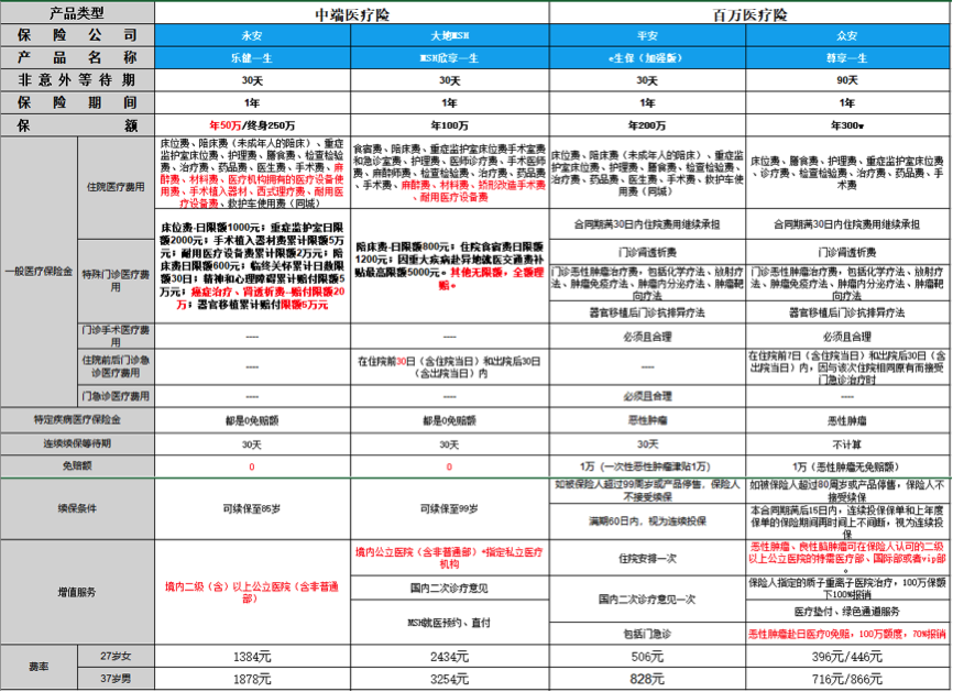 隨(sui)著(zhe)保(bao)險(xian)行(xing)業(ye)的(de)不(bu)斷(duan)發(fa)展(zhan),醫(yi)療(liao)保(bao)險(xian)這(zhe)個(ge)險(xian)種(zhong)也(ye)是(shi)更(geng)新(xin)換(huan)代(dai)非(fei)常(chang)的(de)快(kuai),從(cong)最(zui)初(chu)的(de)小(xiao)額(e)醫(yi)療(liao)保(bao)險(xian),到(dao)後(hou)來(lai)的(de)百(bai)萬(wan)醫(yi)療(liao)險(xian),中(zhong)端(duan)醫(yi)療(liao)保(bao)險(xian),高(gao)端(duan)醫(yi)療(liao)險(xian),海(hai)外(wai)醫(yi)療(liao)險(xian)等(deng)等(deng)。今(jin)天(tian)我(wo)們(men)就(jiu)來(lai)聊(liao)一(yi)聊(liao)最(zui)近(jin)非(fei)常(chang)火(huo)的(de)百(bai)萬(wan)醫(yi)療(liao)險(xian)和(he)終(zhong)端(duan)醫(yi)療險分別是什麼,已經哪些人群適合百萬醫療險,哪些人群更適合中端醫療險。為了方便對比,下圖是中端醫療險和百萬醫療險的產品對比。