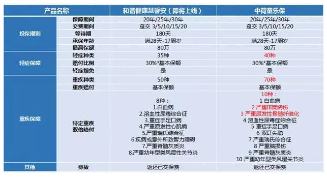 1.我們可以看出這兩個產品都在保障責任結構和基本信息如支付期,等待期,保障期等都是一樣的,中荷童樂保重疾種類 70例,輕症40種,特定疾病10種都多過慧馨安。