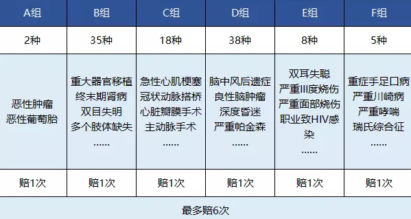 可以看出,該產品將106種嚴重疾病分為6組,每組包含數種至數十種疾病。隻要賠付在某一組中有某種疾病,整個組的疾病就會丟失保障。例如,在賠付急性心肌梗死後,C組中的18種嚴重疾病不再是保障。