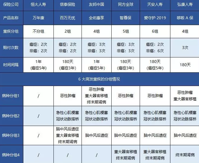 6大疾病盡可能分組:虹康奧寶A分為4組,每組6大病,友邦全友彙香分為3組,一般就足夠了。畢竟,一生中多種疾病的概率不會太大。