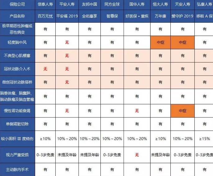 我整理了各種高發輕症,有些產品會將輕症升級到中症,賠付更多的保額,這裏也列出了。詳情如下: