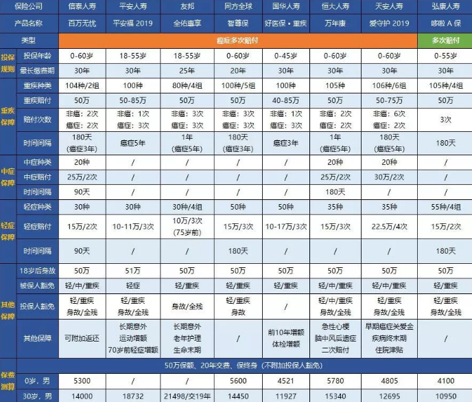 今天我為每個人找來了7個癌症多次賠付產品,並添加了重疾多次賠付產品進行比較,它們分別是: