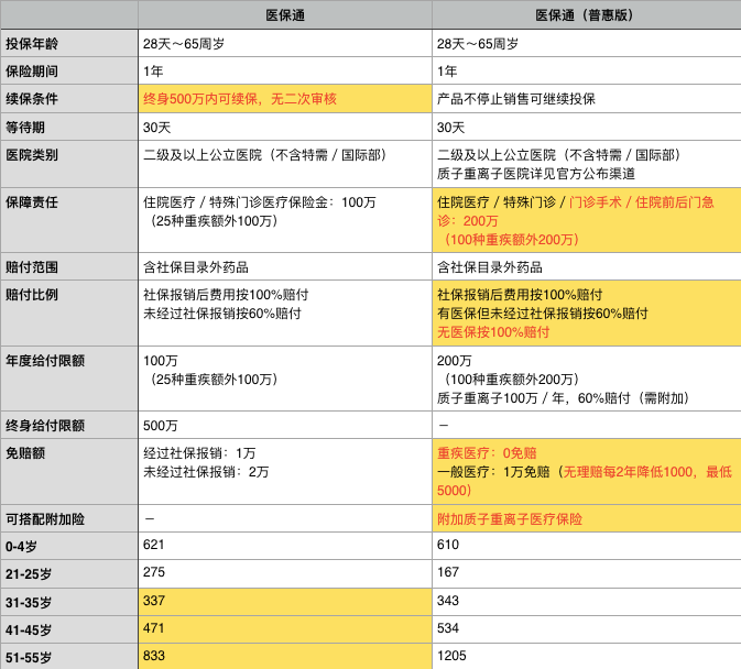 那na麼me醫yi保bao通tong普pu惠hui版ban和he醫yi保bao通tong有you什shen麼me區qu別bie?更geng好hao嗎ma?還hai是shi不bu如ru上shang一yi版ban那na樣yang,我wo編bian寫xie了le一yi張zhang表biao。有you優you勢shi的de項xiang目mu標biao有you黃huang色se。項xiang目mu內nei的de優you化hua責ze任ren標biao記ji為wei紅hong色se,並bing且qie截jie取qu了le幾ji個ge年nian齡ling組zu的de費fei率lv,這zhe更geng直zhi觀guan。