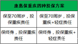 康惠保重大疾病保險提供兩個保險期限長達70歲和終身,因此我們可以在選擇產品時確保以下四種方式。