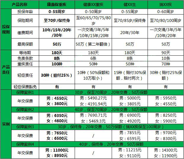 每種產品的主要職責基本相同,包括重疾、輕症和輕症保費豁。根據圖中實例的對比分析,康惠保產品的速率具有一定的優勢,保持70年代率的優勢更大。