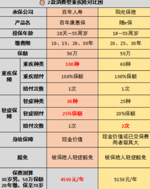 百年康惠保和陽光隨e保進行了比較。圖中的紅色字符是它們各自的優點。