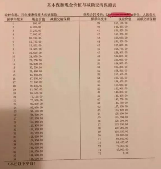 總體而言:康(kang)惠(hui)保(bao)是(shi)一(yi)種(zhong)非(fei)常(chang)全(quan)麵(mian)且(qie)具(ju)有(you)成(cheng)本(ben)效(xiao)益(yi)的(de)消(xiao)費(fei)型(xing)重(zhong)病(bing)保(bao)險(xian)的(de)保(bao)障(zhang)。我(wo)曾(zeng)經(jing)看(kan)過(guo)它(ta)的(de)超(chao)低(di)價(jia)格(ge),並(bing)為(wei)自(zi)己(ji)買(mai)了(le)一(yi)個(ge)。康(kang)惠(hui)保(bao)的(de)現(xian)金(jin)價(jia)值(zhi)表(biao)如(ru)下(xia):