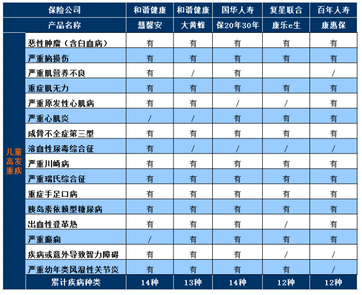 weilefangbiandajia,womenjiangertongdezhongdajibingbaoxianyushichangshangdegaoxingjiabijinxinglebijiao。youjizhongmoxingbingbuzhuanmenzhenduiertongdetedingyanzhongjibing,danbaozhangyefeichangquanmian,ruxia: