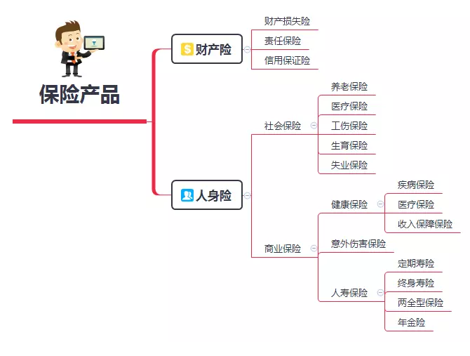 從上圖可以看出,保險主要分為兩類:財產保險和人身保險,然後又細分為小類。