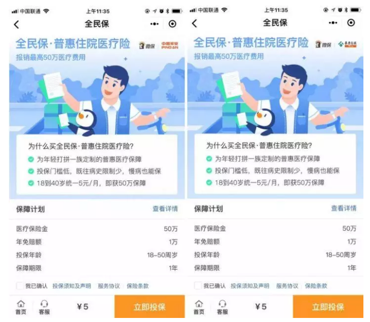 “全民保·醫療保險”承保方有兩個,一家是平安養老,另一家是泰康在線。不同的用戶在從不同的路徑進入時會看到不同的公司,但責任是相同的。