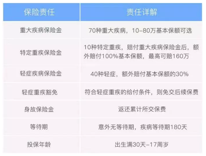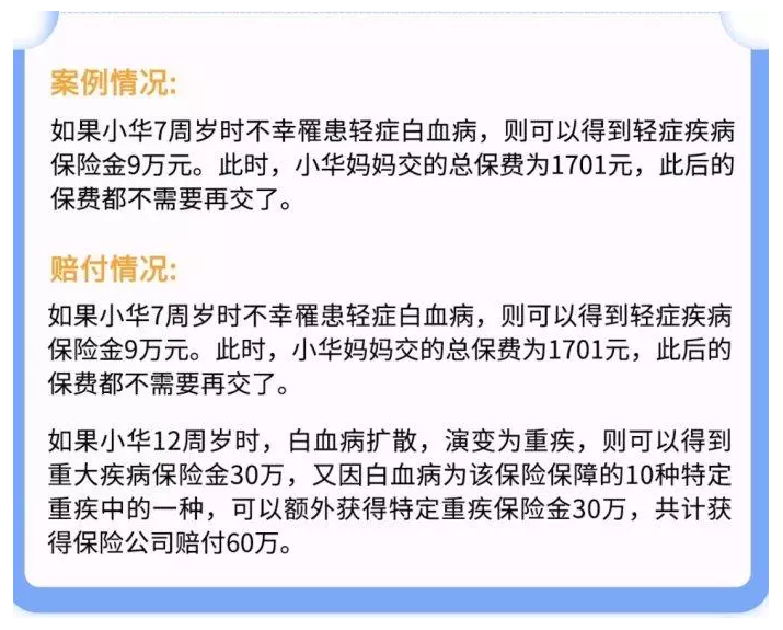 包含70種嚴重疾病,應該是重症患兒最嚴重的疾病保險中。包含兒童疾病的高發病率如:惡性腫瘤(包括白血病)、1型糖尿病、主要器官移植、造血幹細胞移植、終末期腎病、重症哮喘(25歲以前理賠)、嚴重手足口病、川崎病嚴重發病率高。為孩子豎起厚實的保護盾。