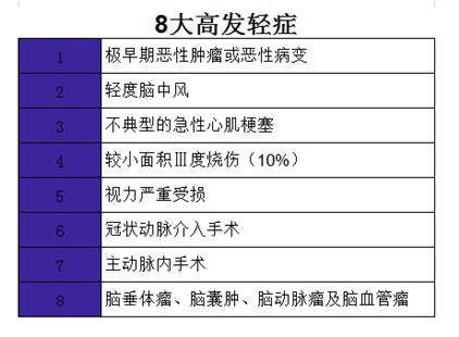在保險條款裏的輕症、中症等疾病,通常為重大疾病的早期狀態或較輕症狀。達不到重疾理賠狀態,但治療費用通常是幾萬不等。8大高發輕症: